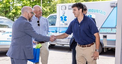 Also joining the reunion Wednesday was Trevor Harbison, a senior environmental science major who was working as activities director for the residential community that day. Harbison, now 21, was nearby setting up a softball game when he heard the commotion at the tennis courts. People were yelling for a doctor. Trained in first aid, cardiopulmonary resuscitation and automated external defibrillator (AED) use, he ran toward the tennis courts to see what he could do.