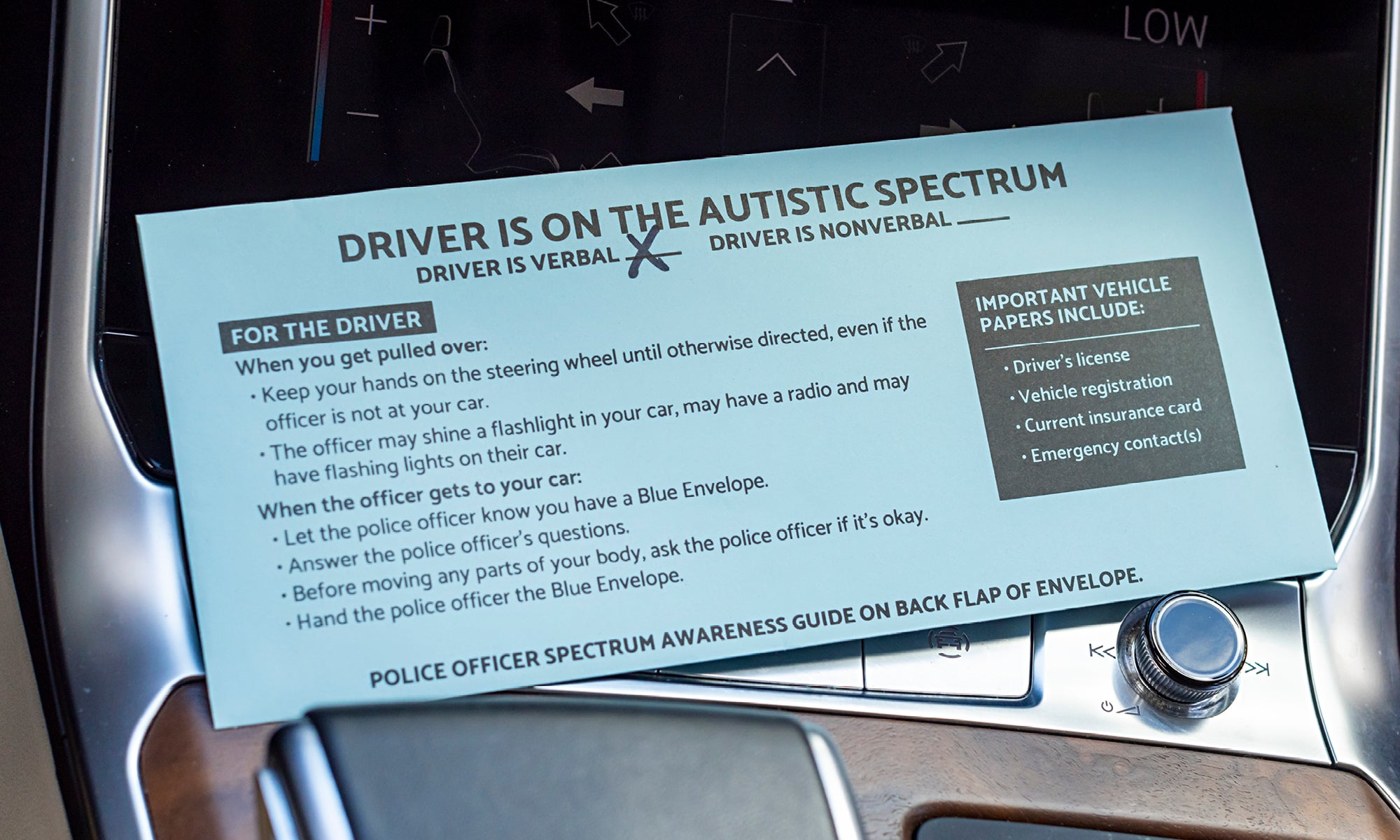 Under the program, drivers carry a blue envelope in their vehicle. The front of the envelope notes the driver is on the autism spectrum and indicates if that person is verbal or nonverbal. It includes instructions for the driver on what they should do during a traffic stop. The back of the envelope has tips for police to help their interaction with the driver go as smoothly as possible.