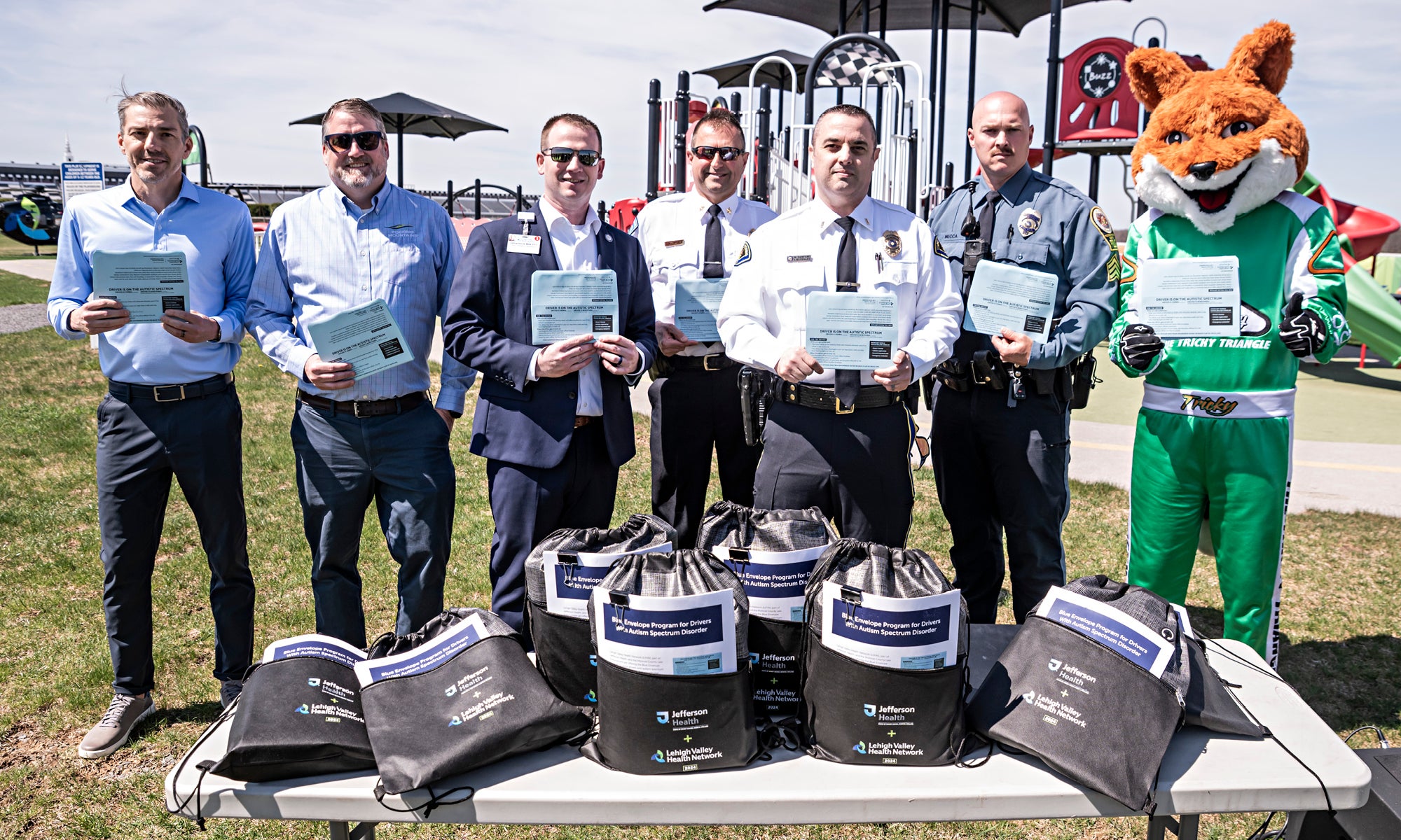 After introducing the Blue Envelope Program to both Lehigh and Northampton Counties, Lehigh Valley Health Network (LVHN), part of Jefferson Health, is expanding the program aimed at helping communication between special-needs drivers and police officers to Monroe County. On April 29, LVHN hosted an event at the Lehigh Valley Reilly Children’s Hospital Inclusive Playground at Pocono Raceway to distribute Blue Envelopes to Monroe County police departments.
