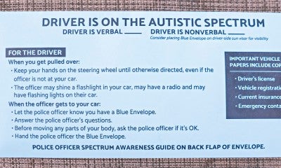 Under the program, drivers carry a blue envelope in their vehicle. The front of the envelope notes the driver is on the autism spectrum and indicates if that person is verbal or nonverbal. It includes instructions for the driver on what they should do during a traffic stop. The back of the envelope has tips for police to help their interaction with the driver go as smoothly as possible.
