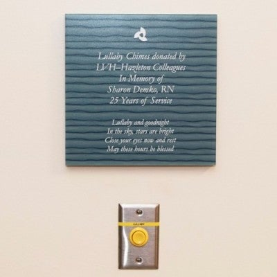 The chimes button is located near a beautiful wall plaque inside the Labor and Delivery suite of the LVH–Hazleton’s Family Birth and Newborn Center. The plaque, which was procured with the help of the LVHN Office of Philanthropy, is inscribed: